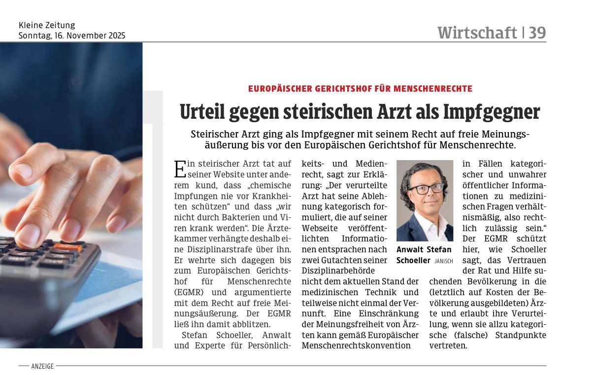 Zum Artikel in der Kleinen Zeitung: https://www.kleinezeitung.at/wirtschaft/20300665/meinungsfreiheit-eines-steirischen-arztes-auf-dem-pruefstand